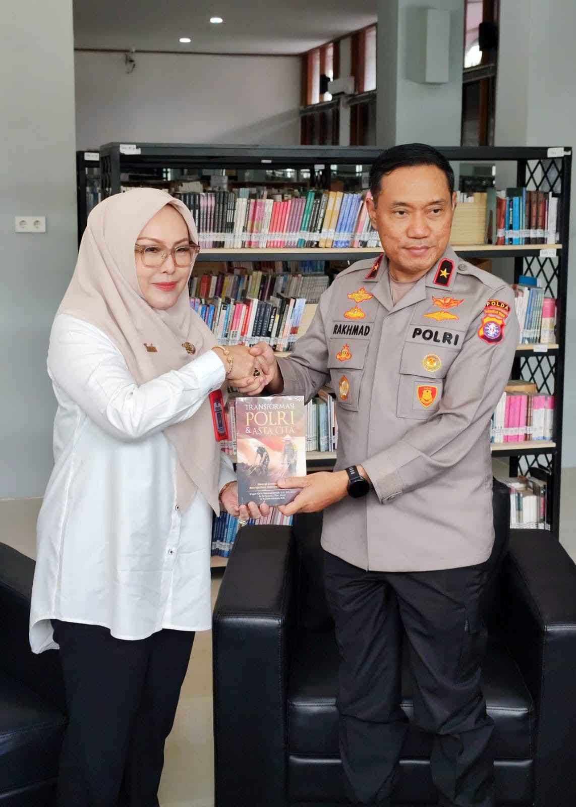 Kepala Dinas Perpustakaan dan Arsip Provinsi Kalimantan Tengah (Kadispursip Kalteng) Adiah Chandra Sari menerima kunjungan Wakapolda Kalteng Brigjen Pol Rakhmad Setiadi, bertempat di Ruang Baca Dewasa, Dispursip Kalteng, Rabu (21/5/2025).