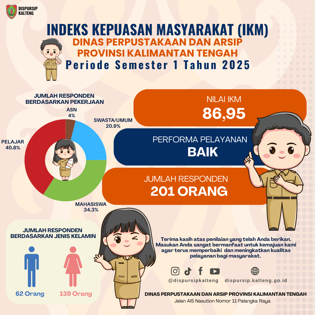 Dinas Perpustakaan dan Arsip Provinsi Kalimantan Tengah (Dispursip Kalteng) telah melaksanakan Survei Kepuasan Masyarakat (SKM) Periode Semester 1 Tahun 2025. Berdasarkan survei yang dilakukan pada periode Januari sampai dengan Juni 2025, diperoleh hasil berupa Indeks Kepuasan Masyarakat (IKM) dengan capaian angka mendekati nilai 87 yaitu sebesar 86,95. Perhitungan ini dengan melibatkan partisipasi dari 201 orang responden yang telah menerima secara langsung pelayanan di Dispursip Kalteng, khususnya layanan Perpustakaan. Dari hasil survei ini juga, performa kinerja unit pelayanan Dispursip Kalteng masuk dalam kategori Baik.